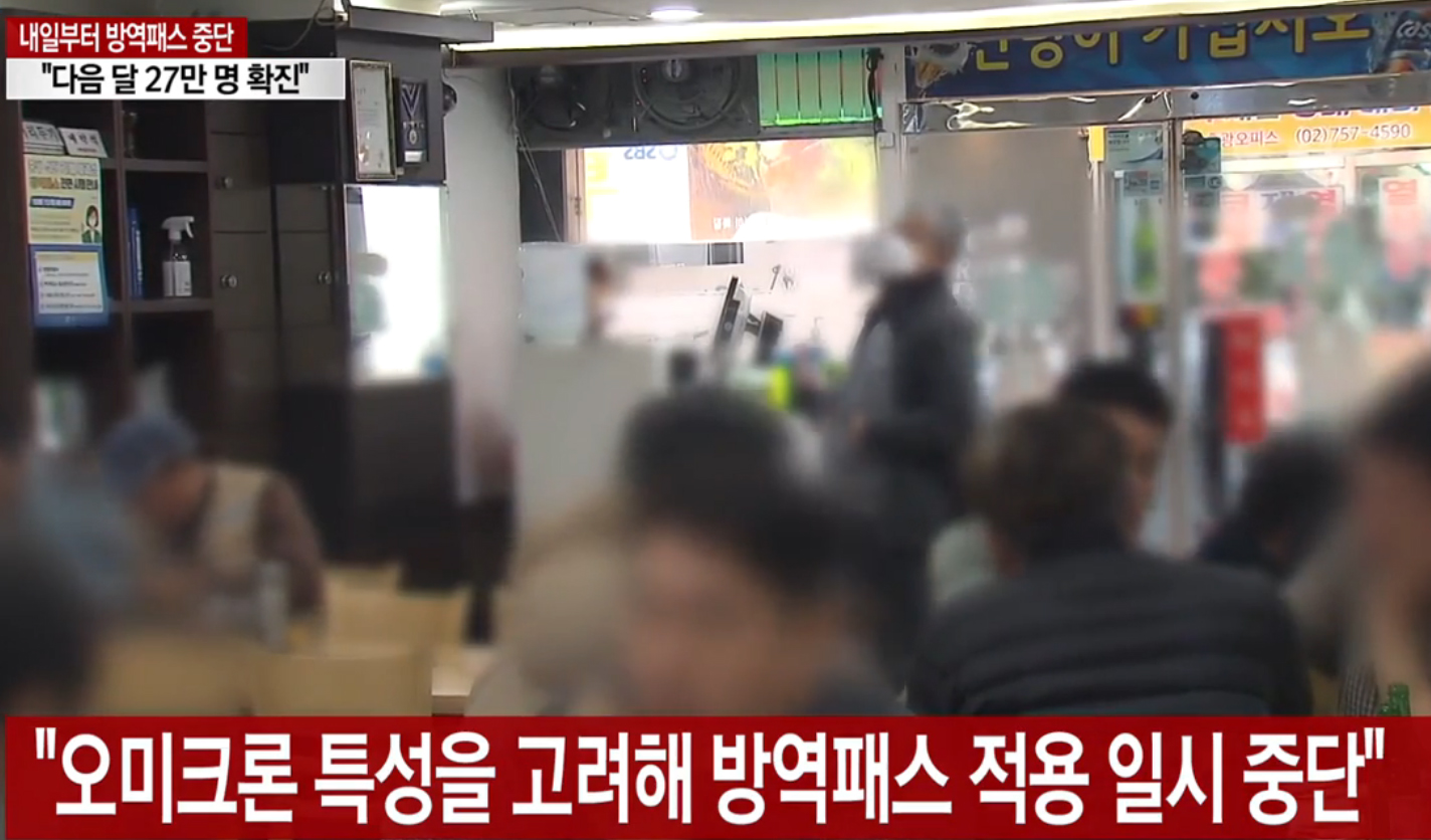 유흥시설과 실내체육시설, 노래연습장, 목욕장과 PC방 등 지금까지 방역패스가 적용되던 11종의 다중이용시설 모두 방역패스가 중단욉니다. 확진자 급증에 따른 보건소의 인력난을 해소하기 위해서입니다.