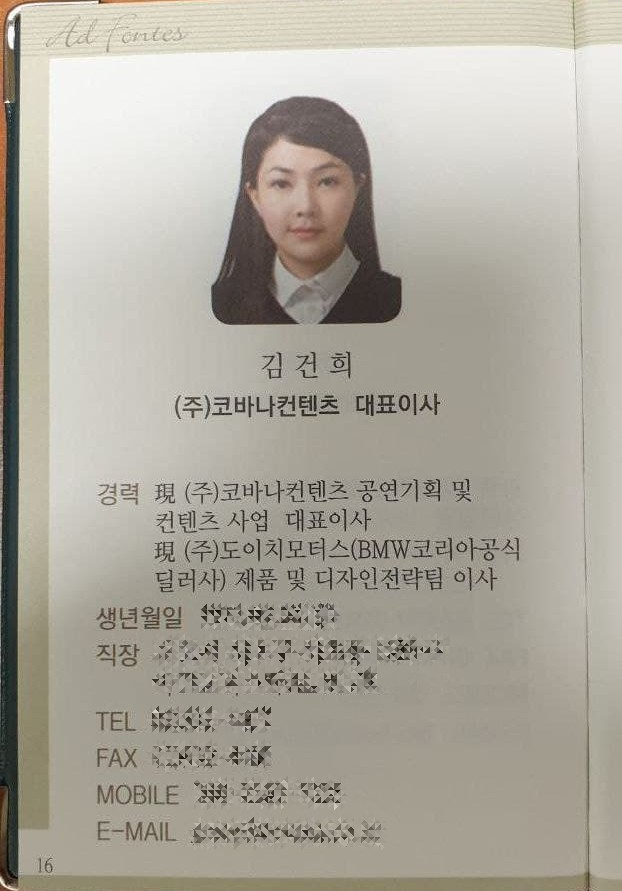 김씨는 2011년 서울대 인문대학 최고지도자 인문학과정(AFP) 원우수첩에 자신의 경력에 '현 (주)도이치모터스 제품 및 디자인전략팀 이사'로 소개했습니다.
