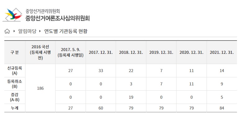이상 여론조사의 자세한 사항은 중앙선거여론조사심의위원회 홈페이지를 참조하시기 바랍니다. 현재 중앙선거여론조사심의위원회에 등록된 여론조사기관은 84개에 달합니다. 정확한 조사를 하는 곳도 있지만, 편향된 조사기관도 없지 않을 것으로 보입니다. 참고하시기 바랍니다.