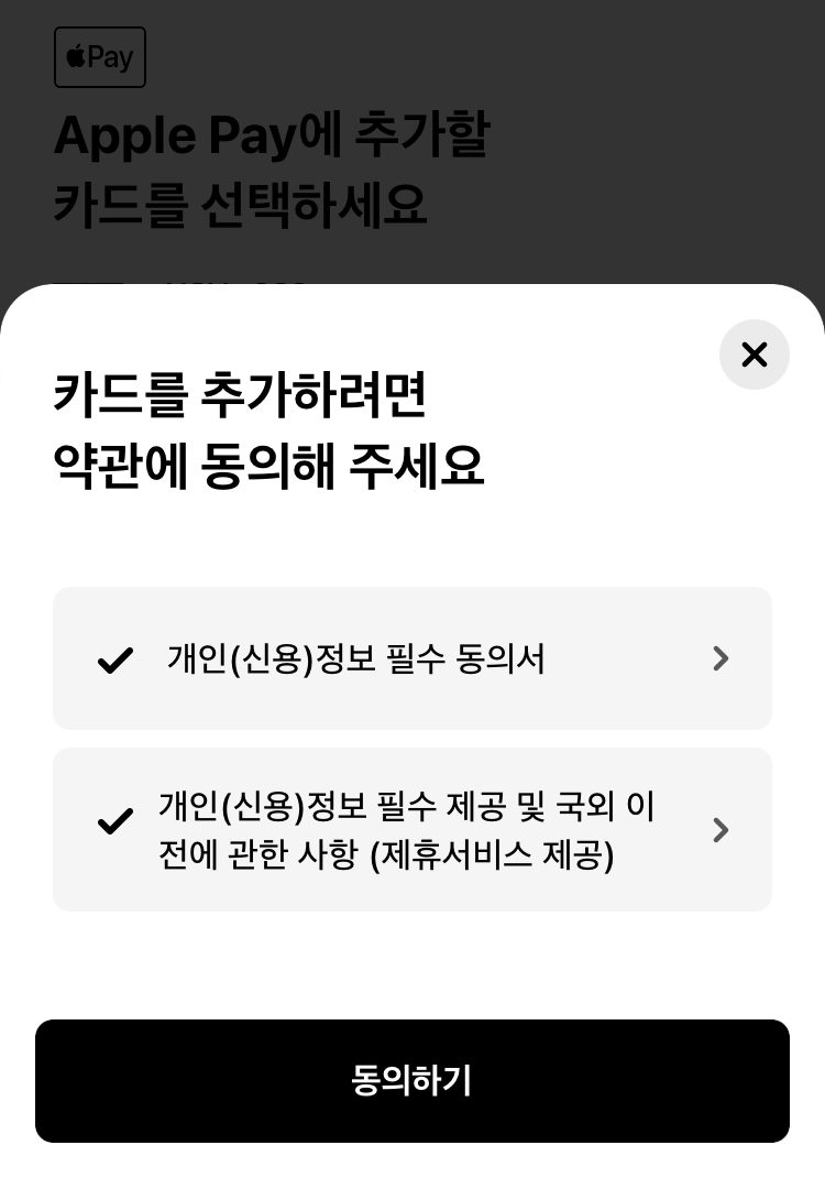 이용약관이 나옵니다. 주루루룩 읽어보고 넘어갑니다. 약관에 동의하면 카드를 추가한다는 화면이 나옵니다.