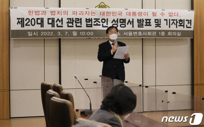 윤 후보 지지 법조인들은 7일 오전 10시 서울 서초구 서울변호사회관에서 기자회견을 열고 "변호사 355명은 윤석열 후보를 지지함을 선언한다"면서 "이번 대선에서 반드시 정권교체가 이뤄지도록 해주실 것을 국민 여러분들께 호소한다"고 밝혔습니다.