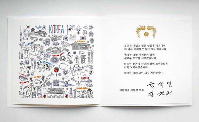 대통령실은 이번 연하장이 'K콘텐츠의 매력을 전 세계로 확산한다'는 국정과제를 반영해 한국 문화와 전통 유무형 문화재를 디자인화 한 것이 특징이라고 밝혔습니다.