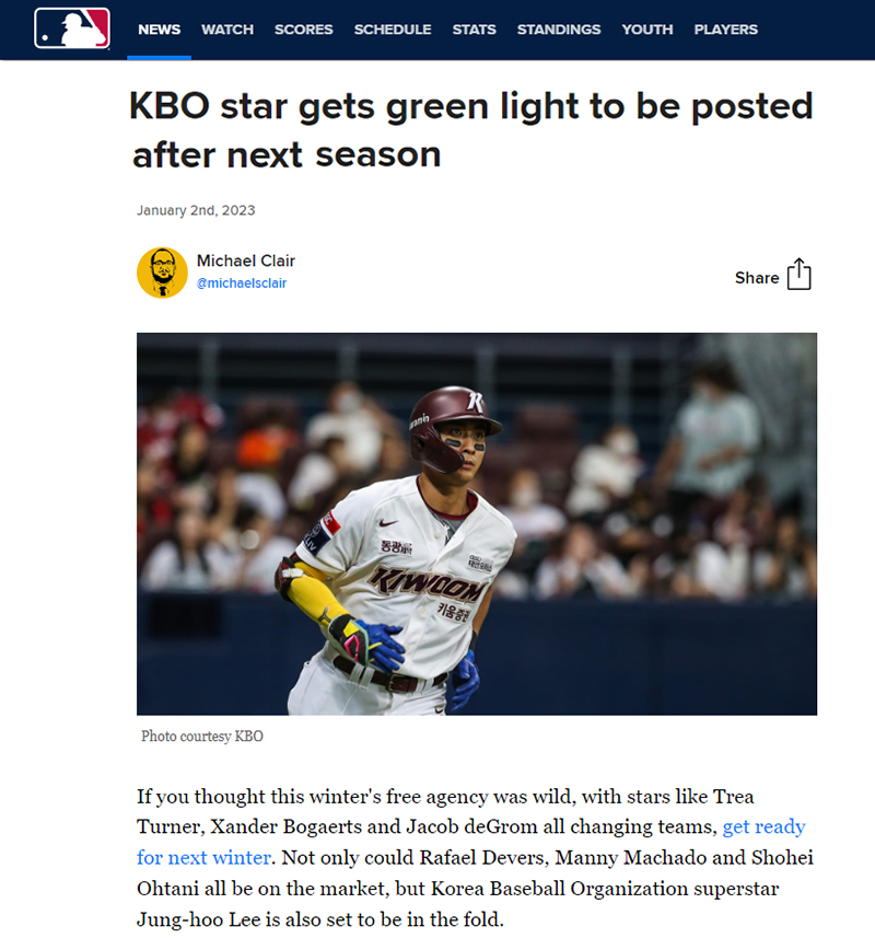 미국 MLB.com이 "라파엘 데버스(보스턴 레드삭스), 매니 마차도(샌디에이고 파드리스), 오타니 쇼헤이(LA 에인절스)가 모두 시장에 나올 수 있을 뿐만 아니라 KBO의 슈퍼스타 이정후도 합류를 앞두고 있다"라고 전하며, 이정후의 메이저리그 입성에 대한 기대감을 높였습니다.